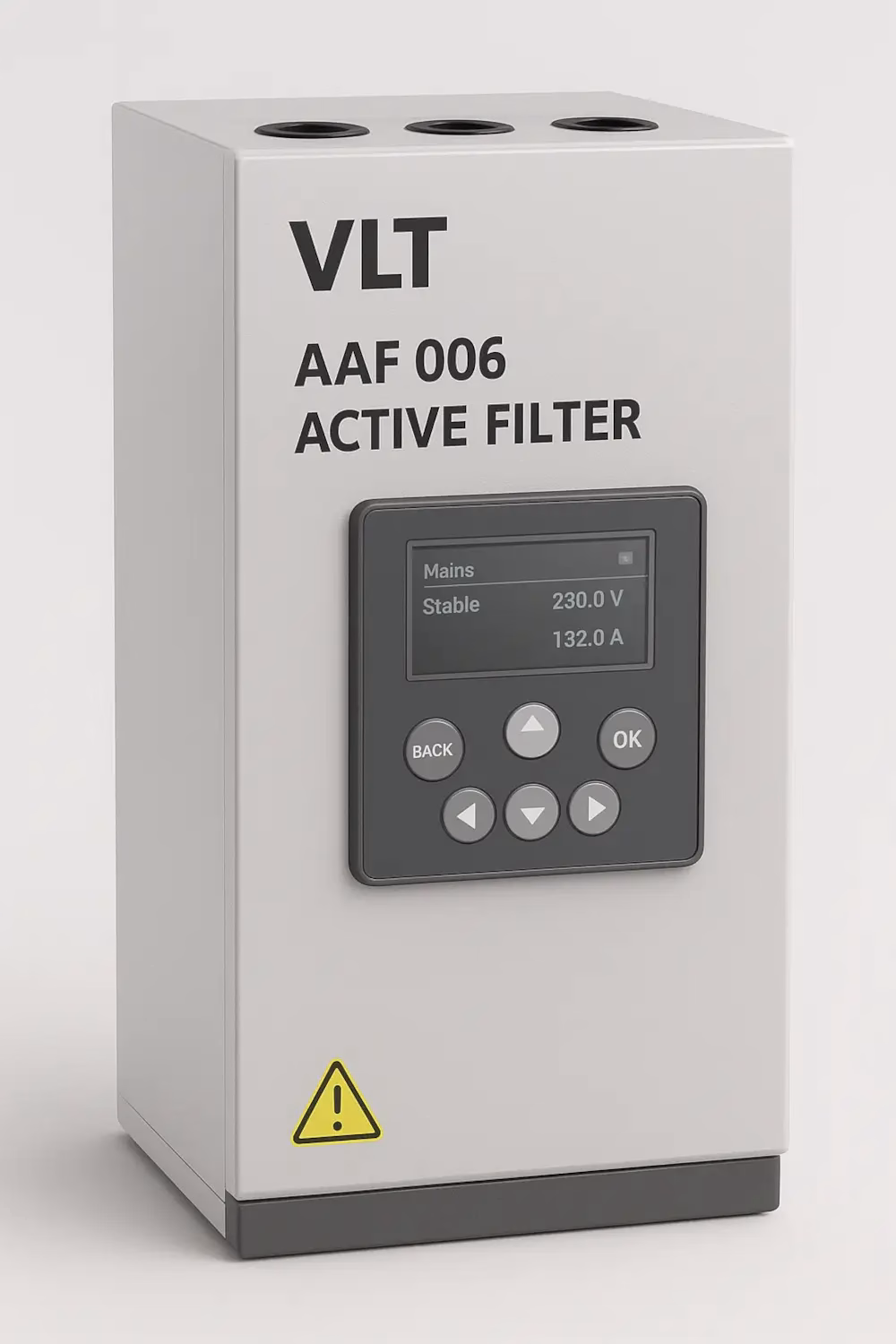 Активний фільтр VLT AAF 006 — це пристрій для активного згладжування гармонік, корекції коефіцієнта потужності та компенсації фазового дисбалансу в електричних мережах. Він призначений для застосування у промислових автоматизованих системах, де використовуються нелінійні навантаження, такі як перетворювачі частоти. AAF 006 ідеально підходить для використання в промислових автоматизованих системах, де є потреба в компенсації гармонік та покращенні якості електричної енергії. Його можна використовувати як для окремих приводів, так і для кількох навантажень одночасно, залежно від конфігурації системи.